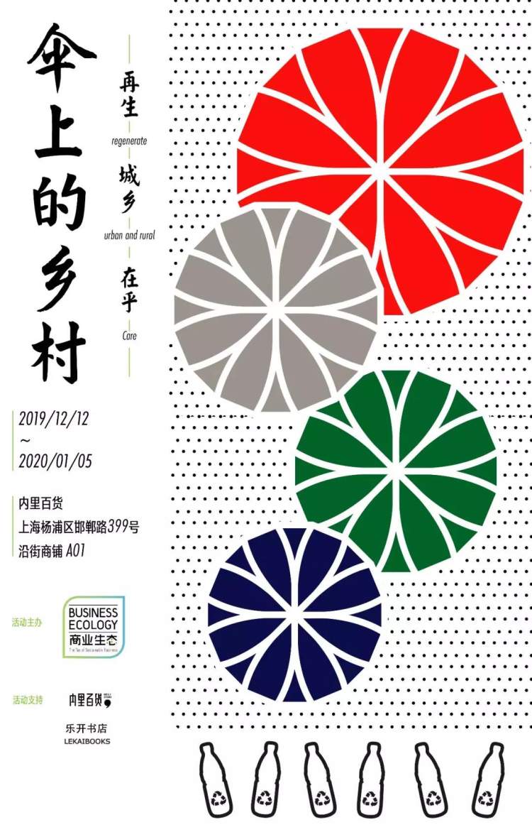 12月12日,商业生态工作室策划的“伞上的乡村:再生·城乡·在乎”展览在上海开幕, 观众可以看到6个回收的塑料瓶如何通过一系列循环再生成为一把雨伞的伞面。同时,展览通过瑞典艺术家的创作再次展现了中国四个不同地方的乡村之美。福建九龙村、云南周城村、上海崇明岛胜利村、云南阿者科村的生态展现在四种不同色彩的雨伞上。