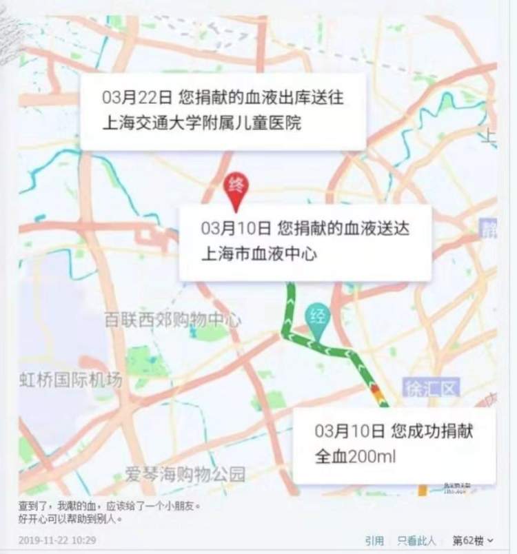 “3月22日,您捐献的血液出库送往上海交通大学附属儿童医院”。