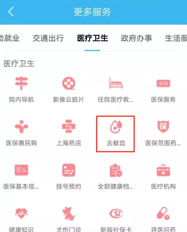 首先,实名登录APP,在搜索栏中输入“去献血”,或点击“随申办”频道-“医疗卫生”-“更多”-点击“去献血”;