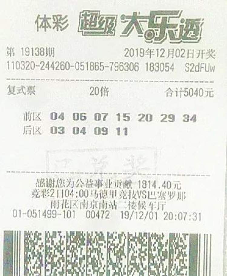 有意思的是,这张彩票购买于南京南站。房先生说,他12月1日出差经过南京南站,于是在二楼候车大厅随机购买了一张大乐透20倍的“7+4”复式票。12月2日大乐透开奖,前区开出号码“04、06、07、20、29”,后区开出号码“02、04”;房先生购买的彩票前区号码为“04、06、07、15、20、29、34”,后区为“03、04、09、11”——这张彩票前区号码全部命中,后区“04”也命中,但“02”没中,单票包含60注二等奖,、60注三等奖、600注五等奖、600注七等奖、600注八等奖、600注九等奖,总奖金超2000万元。虽然因为后区的一个号码之差而和头奖擦肩而过,但房先生很满足,“不能太贪心,2000万很知足了。”