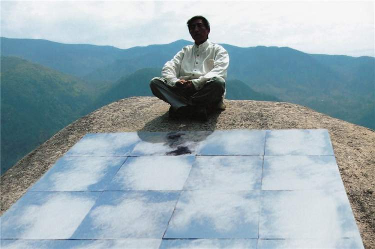 来自天台的艺术家梁绍基,他持续以蚕的生命历程为媒介进行艺术创作,本次参展的《云》是他携蚕丝弥满的镜子驱车去天台名胜琼台仙谷追云的记录。