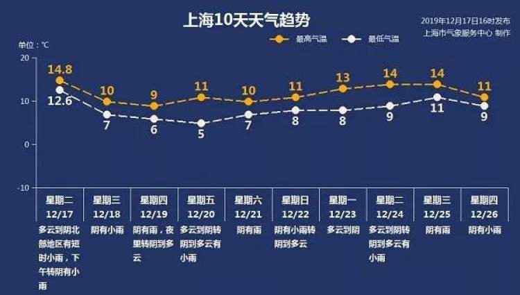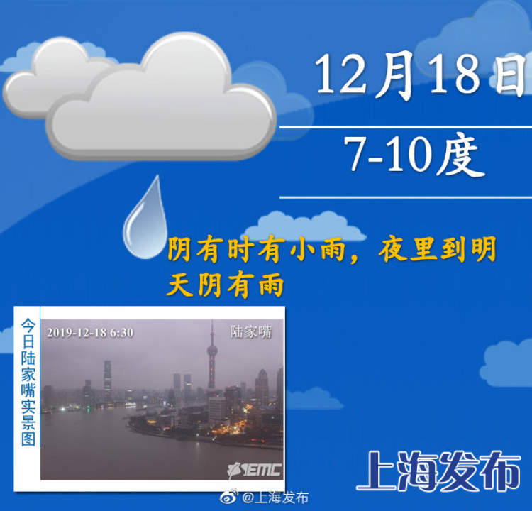 ”冬黄梅“开始了?太阳公公上班要待新年? 周到君 2019-12-18 来源:周到上海 今天阴有时有小雨,最高温度10度,夜里到明天阴有雨。明天最低温度6度。阴雨不断,体感湿冷,提醒大家出门带好雨具,注意保暖哦~ 未来一段时间,阴冷将会成为上海天气主旋律。告别异常偏暖的12月中旬,冷暖空气昨天正式开启为期近2周的“交战“。 来源:周到上海 作者:周到君 赞一个 (0)