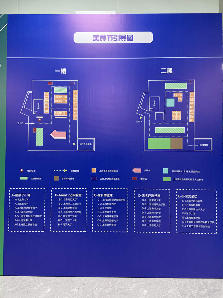 整个美食节的举办场所在华理第一食堂的一楼和二楼,分为“硬菜了不得”“amazing实验室”“家乡的滋味”“舌尖环游世界”“小食光记忆”“青未来健康”6大主题区域。