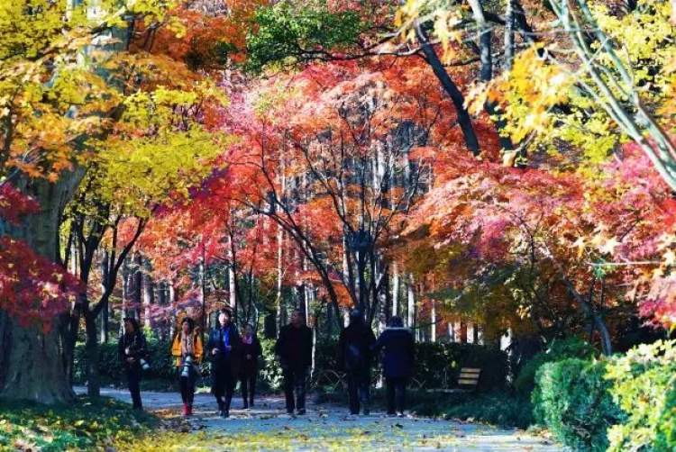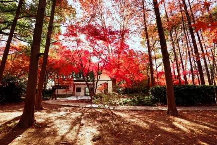 在“秋林爱晚”景区,青枫、红枫、鸡爪槭等各类枫树已经集体被大自然的调色板染红。片片红枫,点缀了美丽森林,如诗如画。