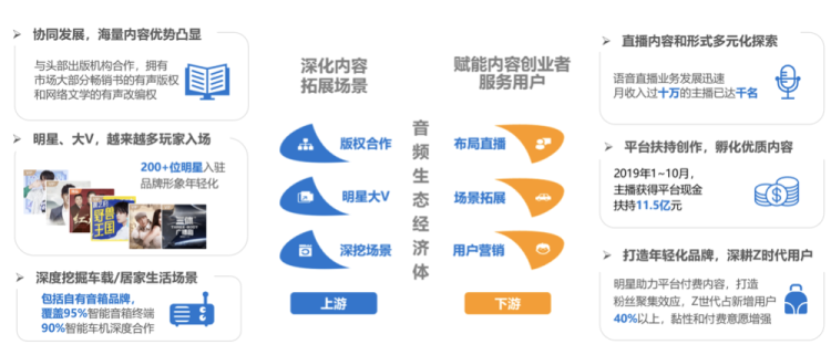 另一方面,用户对直播内容的需求不断提升,音频直播开始进入大众视野,迎来新的发展机遇。喜马拉雅为代表的泛知识付费平台通过流量支持计划,使优秀主播得到更多机会的曝光,同时优质主播为泛知识付费平台带来新流量。2019喜马拉雅123狂欢节期间,王斌等头部主播单场直播销售额超过100万,远超传统售卖方式获得收入的速度。