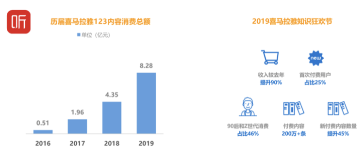 报告认为,泛知识付费市场的爆发,源于追求精神消费的新消费趋势。以2019喜马拉雅123知识狂欢节为例,内容消费总额8.28亿,在各项指标实明显的增长,用户对音频付费内容认可度越来越高,证明越来越多的用户,尤其是高消费能力用户愿意为高质量的内容付费。