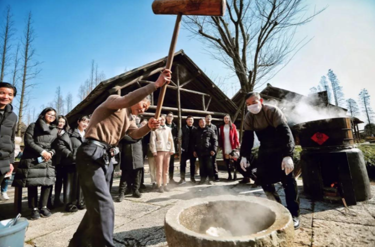 在村头集市,乌村的村民们会用最原始的土灶制作出最原味的镬糍,现场品尝红糖镬糍茶,也可以带回家与亲朋好友分享。除此之外,乌村还会打年糕、写春联、剪窗花、舞龙舞狮……