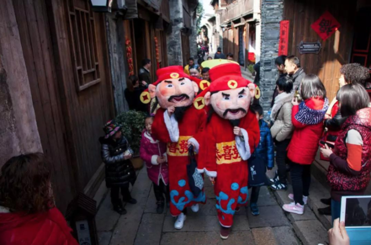 年三十至年初五,西栅老街上“福禄寿财神”为游客送祝福,派利市。喜庆的拜年船缓游河道,身着传统服装的男女站在船头,向两岸游客招手作揖,送上水乡祝福。