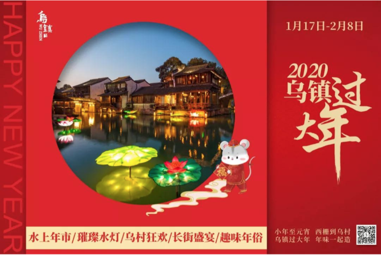 鼠年,乌镇秉承传统文化,推出水灯会、水上年市、长街宴、祭年神等传统年味活动,与乌镇临近的乌村也推出“村味大年”,不仅有传统的村头年货集市,也有春节七天乐大派对,以及别出心裁的互联网、戏剧、农耕三大主题冬令营。