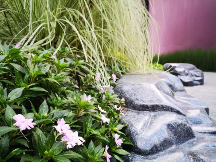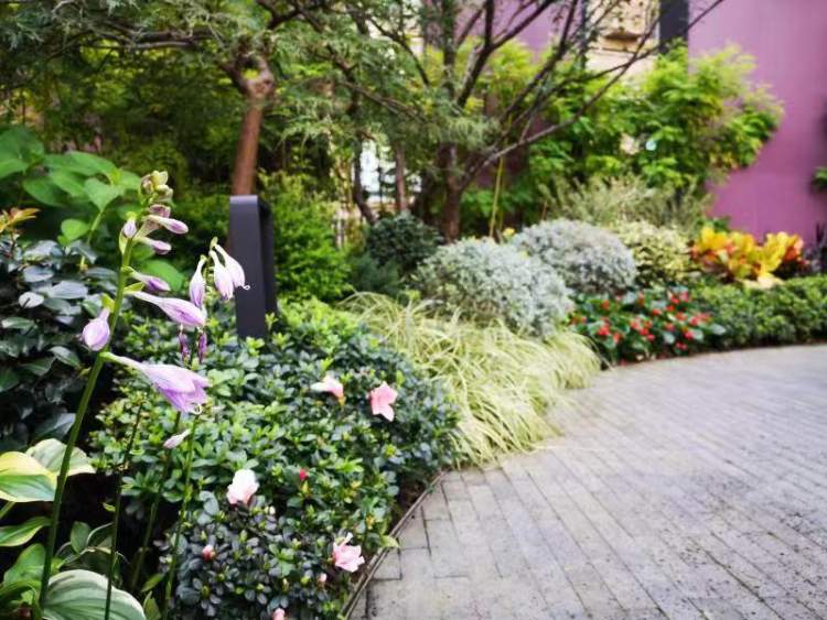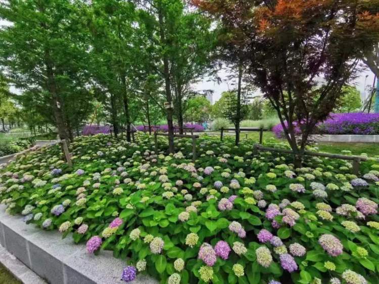 同时增加开花地被、开花灌木、新优品种如细叶芒、 园艺八仙花、紫花美女樱、德国鸢尾、花叶络石、玉簪等植物组成的花境,突出体现富于色彩变化的植物景观效果。