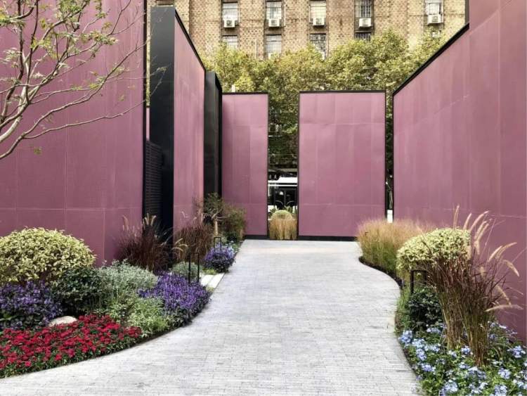位于南京西路石门一路口的静安区石南街心花园,利用色彩斑斓的欧洲模纹花坛式垂直绿墙和莫兰迪色系景墙的组合设计,隔离场地变电房等市政设施,形成丰富的空间转换,外部是以艺术化绿墙为背景的街角空间,内部则是淡雅精致的城市庭院。