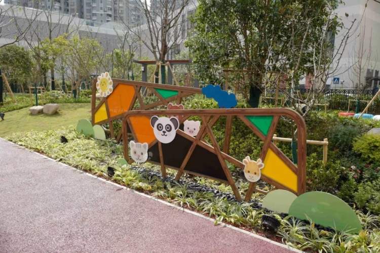 由于位置紧邻幼儿园,植物配置上选了无刺、无污染、无安全隐患的植物品种和一部分奇艺花型的园艺八仙花、百子莲等,结合常绿树、落叶乔木、花灌木、色叶植物等各类植物,通过设施植物铭牌,起到科普宣传的作用。
