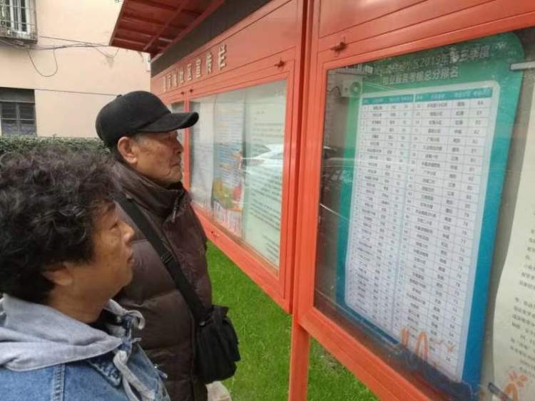 今天在虹口区凉城新村街道居民区宣传橱窗前,一群居民围观议论着:“典雅公寓:兴虹物业服务考核总分99分;华科公寓:虹帆物业服务考核总分97分;虹凉馨苑:朕华物业服务考核总分96分;复旦小区:复乐物业服务考核总分96分;亚馨苑:恬心物业服务考核总分96分……锦苑小区:宏苑物业服务考核总分62分;水木年华:爱仁物业服务考核总分57分;久业家园:建玮物业服务考核总分56分。”