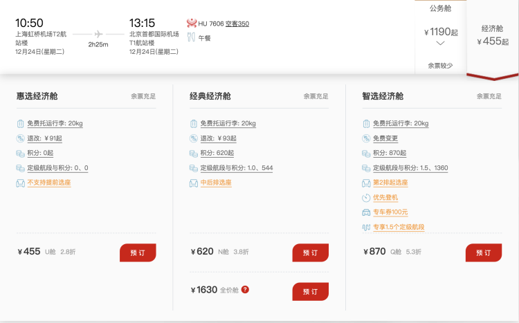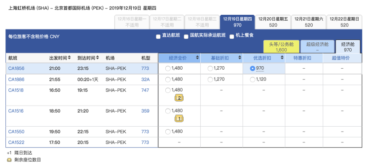 国航目前经济舱全价票仍保持为1480元,查阅发现,12月23日起,该航线的票价上涨为1610元,明年1月1日,该航线的经济舱全价票显示为1630元。