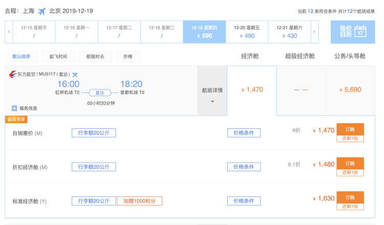在东方航空的官网上,记者发现,其目前上海-北京航线的经济舱全价票已是1630元。