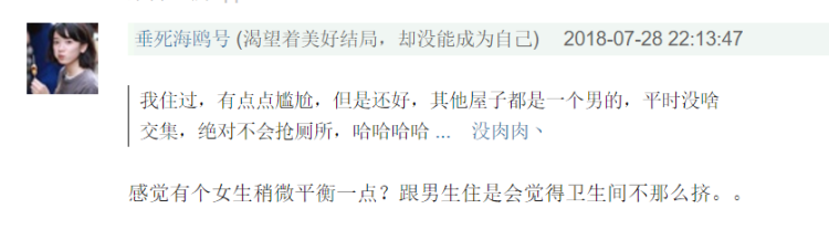 “没肉肉”:我住过,有点点尴尬,但是还好,其他屋子都是一个男的,平时没啥交集,绝对不会抢厕所;