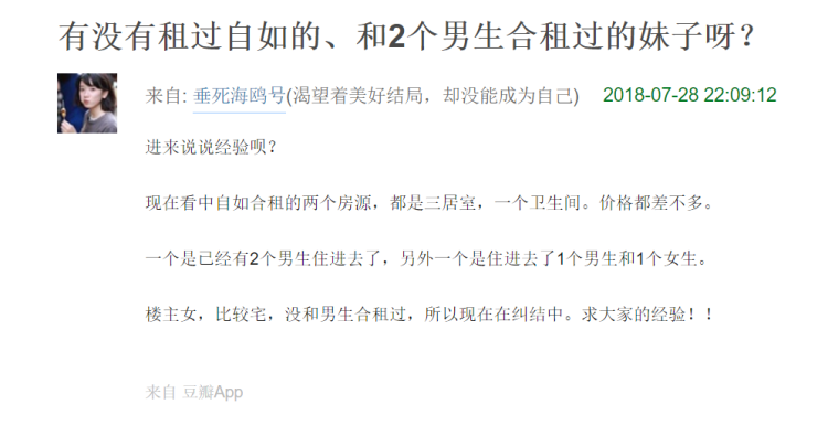 在豆瓣小组,网友垂“死海鸥号”发了一则《有没有租过自如的、和2个男生合租过的妹子呀?》帖子,贴内称现有一个三居室,其中一间住了两个男生,另一间一男一女,因没有和男生合租过,比较纠结,就发帖征求大家的意见。