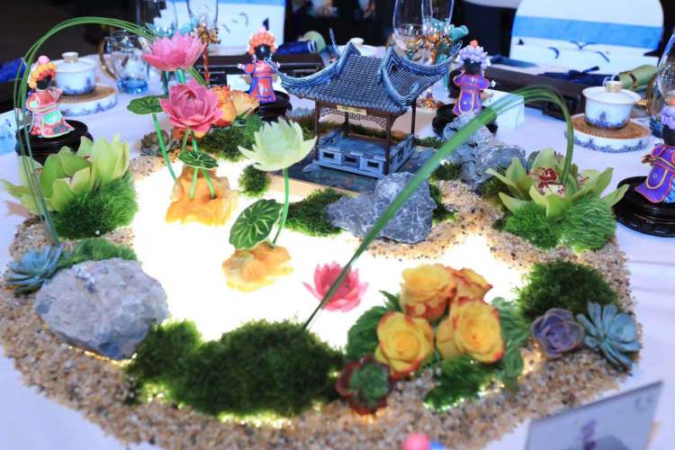 在中华美食非遗技艺展示环节,国家高级技师徐佳杰以“荷花”为主题,结合了中餐独有的美食艺术雕刻技艺——食雕,将江南地区“寓文于食,融情于景”的理念融入器皿、餐桌设计中,以江南园林的微缩景观为核心,整体效果令人叹为观止。