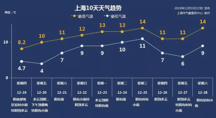 今天本市中心城区徐家汇站最低气温仅4.7℃,最高气温也只有8.2℃,比昨天的9.2℃还低了1度,再次成为入冬以来“最低”的最高气温。