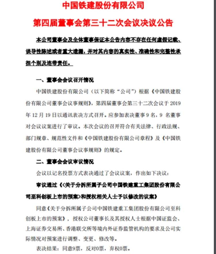 在12月19日早间披露“A拆A”预案之后,中国铁建(601186)当日晚间公告称,董事会审议通过关于分拆所属子公司中国铁建重工集团股份有限公司(简称“铁建重工”)至科创板上市的预案,以及授权相关人士予以修改的议案,以做大做强公司装备制造板块。这是今年12月13日《上市公司分拆所属子公司境内上市试点若干规定》发布后,首家宣告分拆上市的公司。