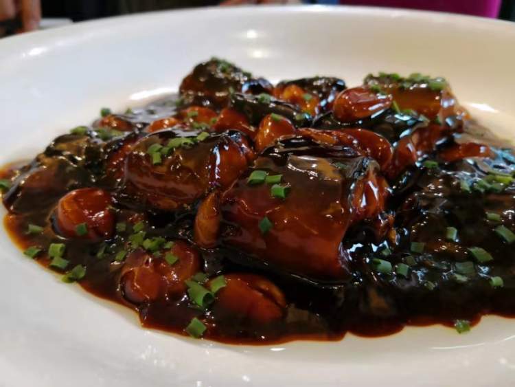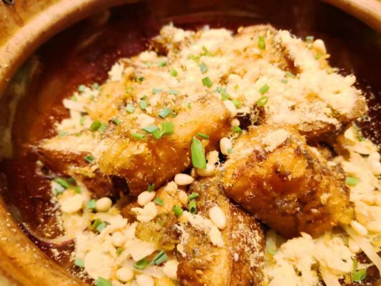 同样,大黄鱼为很多老上海所喜爱。1.2斤左右的深海大黄鱼,从鱼口取出黄鱼内脏和黄鱼龙骨,将黄鱼洗净后放葱姜和淡盐水腌制4小时左右,然后从黄鱼口灌入冻蟹粉,用虾茸胶封鱼口,蒸15分钟左右,再放入葱姜丝,一道脍炙人口的灌汤蟹粉大黄鱼做好了。灌汤蟹粉大黄鱼端到桌上,切开鱼肚皮,蟹粉就会慢慢流出,让人看后谗言欲滴。