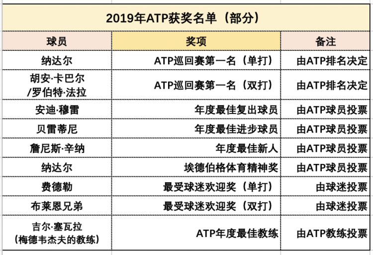2019赛季澳网和温网的冠军德约科维奇,没有出现在这份获奖名单中。