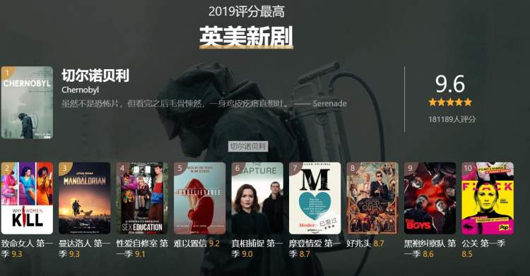 当然这两份列表只有一定的参考价值,十佳榜单结合评分和评分人数综合算出,早几年豆瓣用户不够庞大,那时候的作品自然吃亏。今年的《切尔诺贝利》《我们与恶的距离》能赶超《神探夏洛克》《权力的游戏1》等经典神剧,位列十佳剧集的榜眼探花,可能就得益于打分人数多。