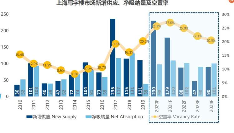 分析认为,外资企业将受对外开放政策与良好市场前景的驱动寻求扩租,而科技行业的发展将持续推升写字楼需求,因此净吸纳量对比2019年应将有所反弹。供应方面,由于部分新项目推迟入市,2020年市场将迎来供应高峰,预计整体空置率推升至25.6%,而租金将继续下滑,“以价换量”将成为未来两年租赁市场的主要方向。