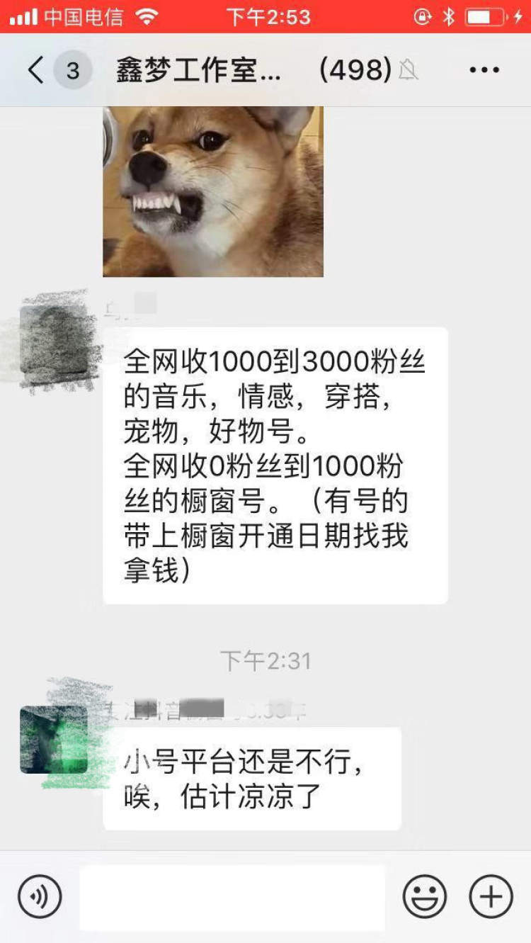 “全网收1000到3000粉丝的音乐、情感、穿搭、宠物、好物号(有号的带上橱窗开通日期找我拿钱)。”在一个名为“鑫梦工作室”的账号交易微信群里,类似的吆喝比比皆是。