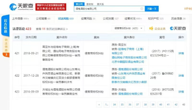 另外,天眼查风险显示,酒鬼酒公司目前有492条法律诉讼信息,其中案由为侵害商标权纠纷的高达424条。而2017年至2019年,酒鬼酒与吉首石磊文化一直存在著作权转让合同纠纷。