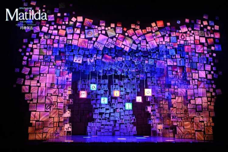 而让所有观众震撼的堆满字母积木的舞台,也是经过精心设计的。上面的字母也不是随机出现的,而是有序组成一个个单词,构成玛蒂尔达的世界。比如“book”、“story”等等。