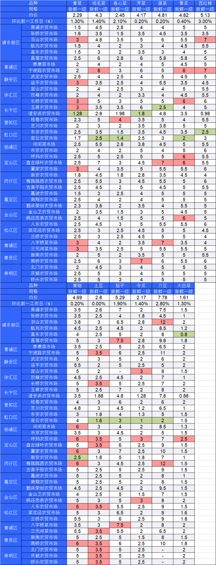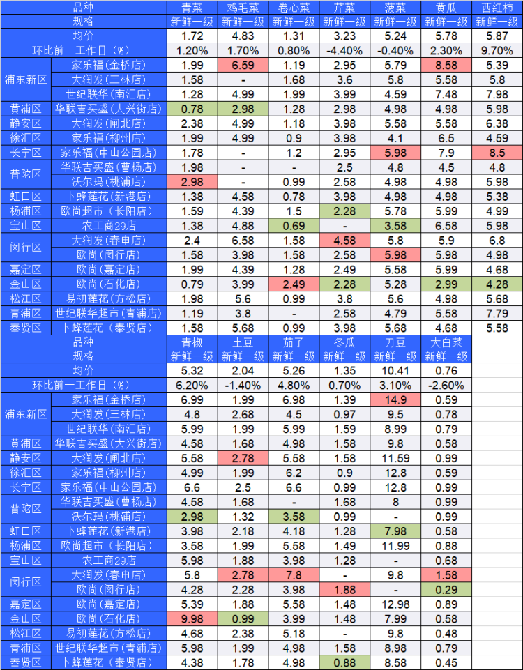 ■粉底标注代表该蔬菜品种在上述农贸市场或超市的最高价;绿底标注代表该蔬菜品种在上述农贸市场或超市的最低价
