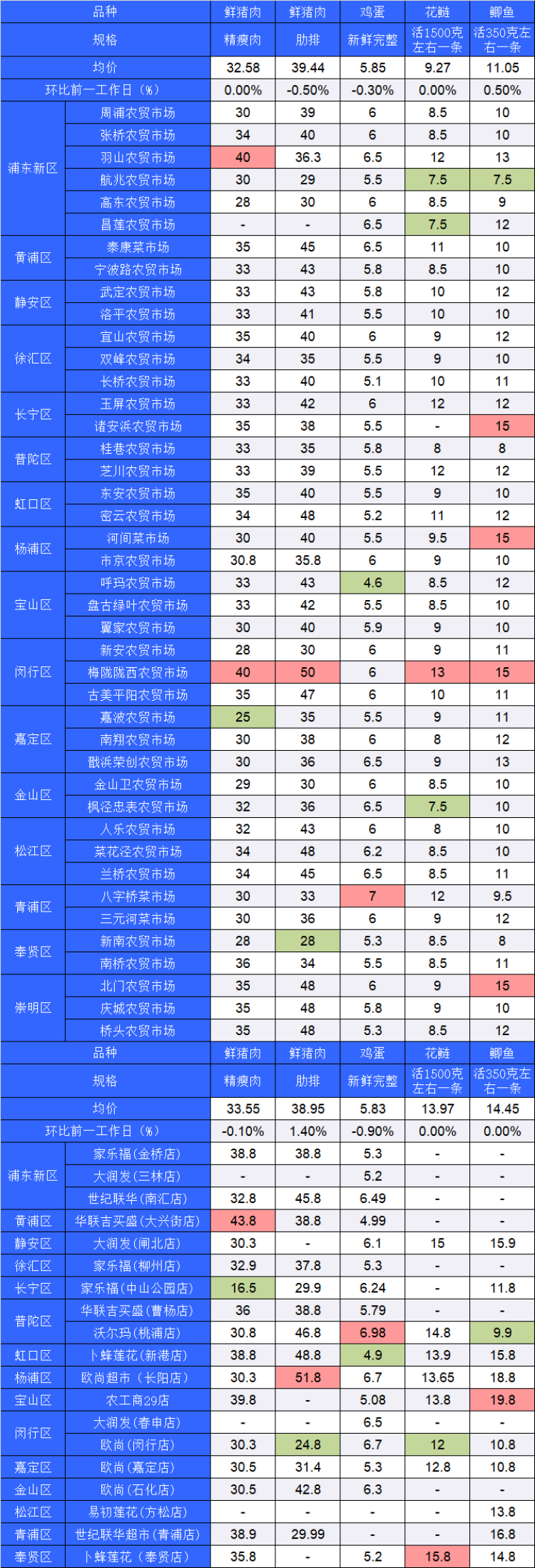 ■粉底标注代表该肉蛋鱼品种在上述农贸市场或超市的最高价;绿底标注代表该肉蛋鱼品种在上述农贸市场或超市的最低价