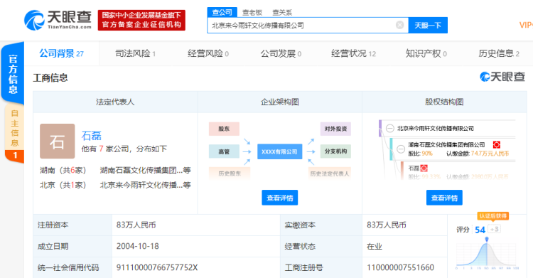 天眼查数据显示,举报人石磊为北京来今雨轩文化传播公司的法定代表人。该公司成立于2004年10月,注册资本83万。石磊通过湖南石磊文化传播集团有限公司间接持有该公司89.4%的股权,为该公司最终受益人。