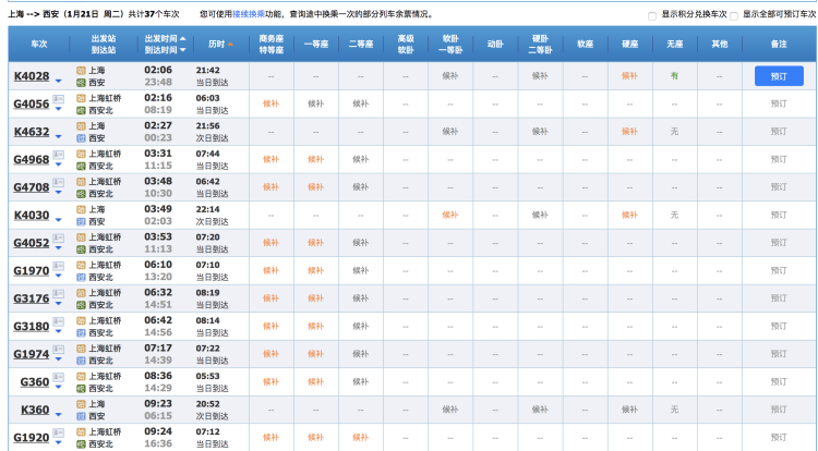今天铁路火车票已经售卖至明年1月21日(腊月二十七)的火车票。目前,春运火车票已进入售票最高峰,火车票越来越紧俏。以上海-西安为例,记者发现,1月21日该条线路的除了一班凌晨2点06分始发,历时21个小时46分钟的K字头列车显示有“无座”票剩余外,其他三十多个车次均为任何剩票,部分车次显示可“候补”。