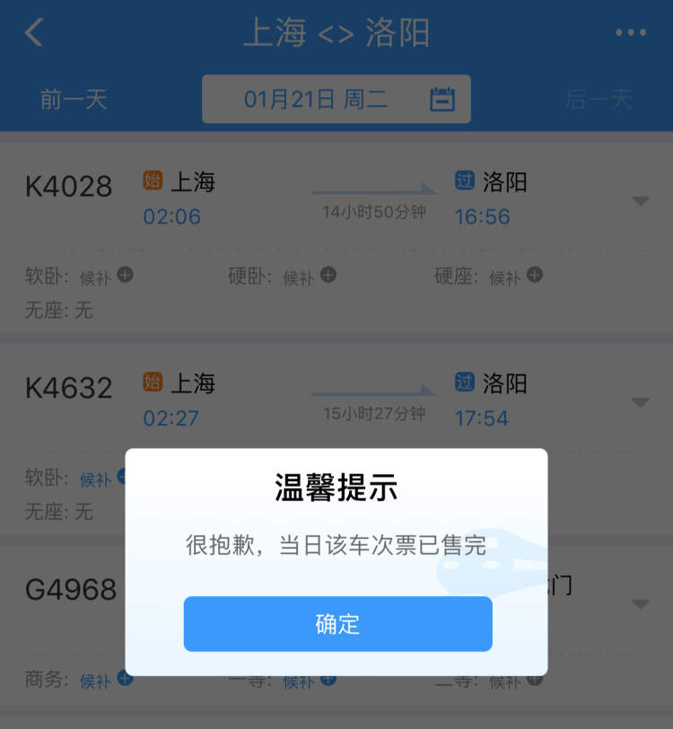 记者:K4028(上海-洛阳)车票显示没有票,你们一定能买到吗?