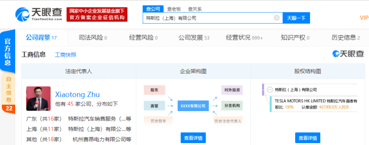 天眼查数据显示,特斯拉(上海)有限公司成立于2018年5月,注册资本467000万元人民币。特斯拉上海工厂于今年1月份破土动工,并且已经投产,计划今年年底能够生产至少1000辆Model3。