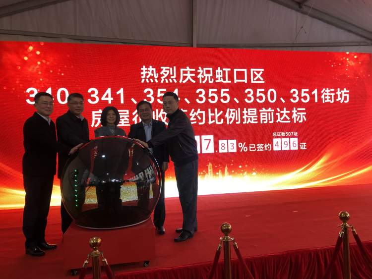 “截止到2019年12月25日,虹口区340、341、354、355、350、351街坊签约证数496证,签约比例97.83%。提前达标,高比例生效。”当虹口区副区长周嵘宣布完这一好消息后,台下的掌声、彩炮声、腰鼓声此起彼伏,但都抵不住街坊们激动的心声——“我们大伙等征收等了16年,今天心中的大石头总算落地了。”