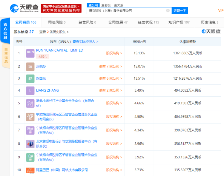 天眼查数据显示,恒玄科技成立于2015年6月,注册资本9000万元人民币,法定代表人为董事长张亮。