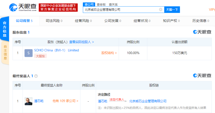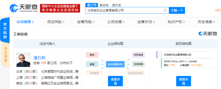 天眼查数据显示,日前潘石屹名下新增一家公司,为北京威石企业管理有限公司。