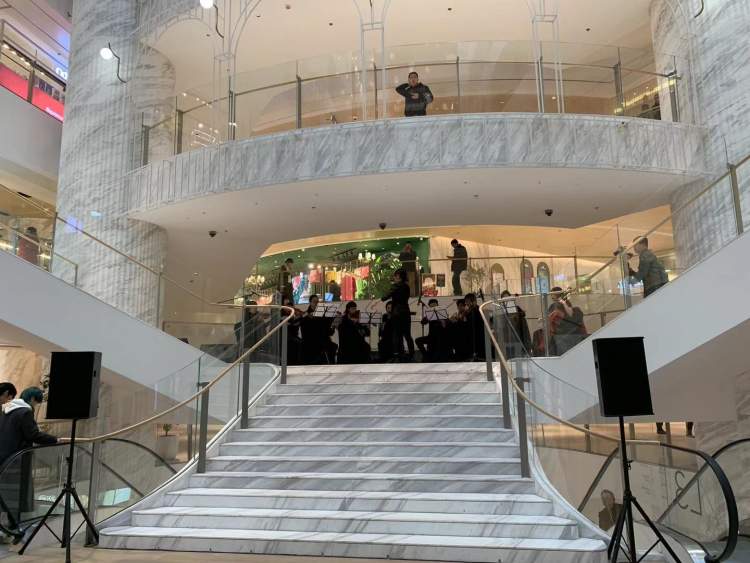 通往商场4楼的半层阶梯处,乐手们正在演奏欢快的迎新曲目;3楼中庭偶尔还能遇见快闪舞蹈;靠近4楼中庭处的区域,日本品牌巴慕达正在举行中国首家体验店的发布仪式……