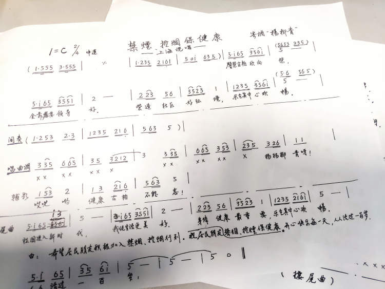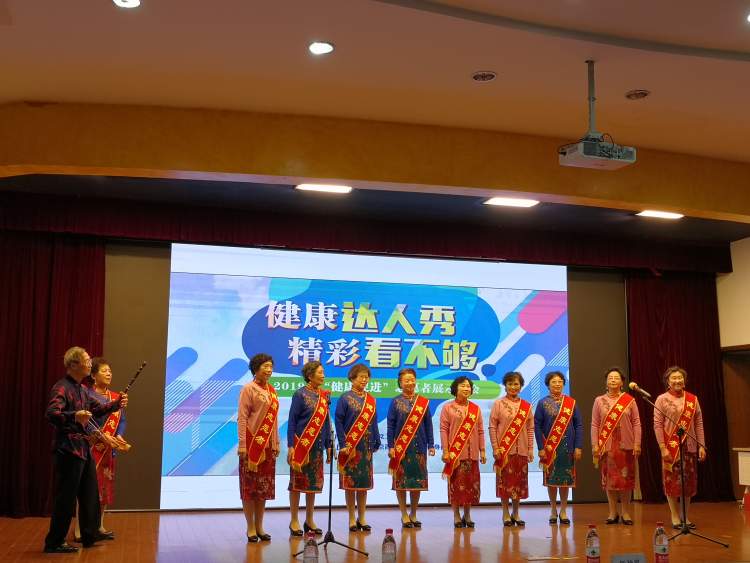 陈金胜拉起二胡,庞宝英打起竹板,阿姨们身着旗袍,身上披着“健康志愿者”的绶带,开口了——