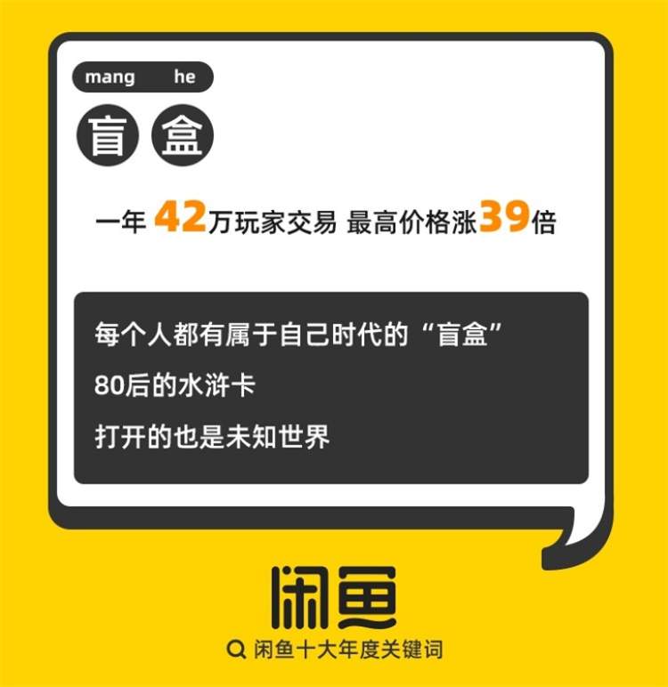 闲鱼数据还显示,过去一年 ,盲盒的最高价格上涨39倍,共有42万玩家完成了盲盒交易。在热爱盲盒的年轻人眼里,盲盒像80后小时候收集的水浒卡,每一包干脆面里面的卡片都是未知的,带来新奇的乐趣。