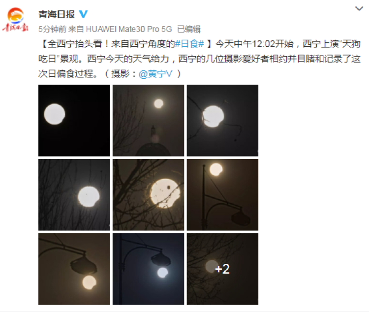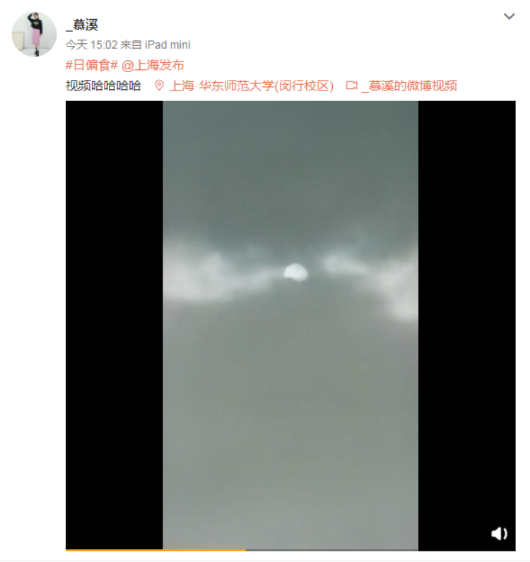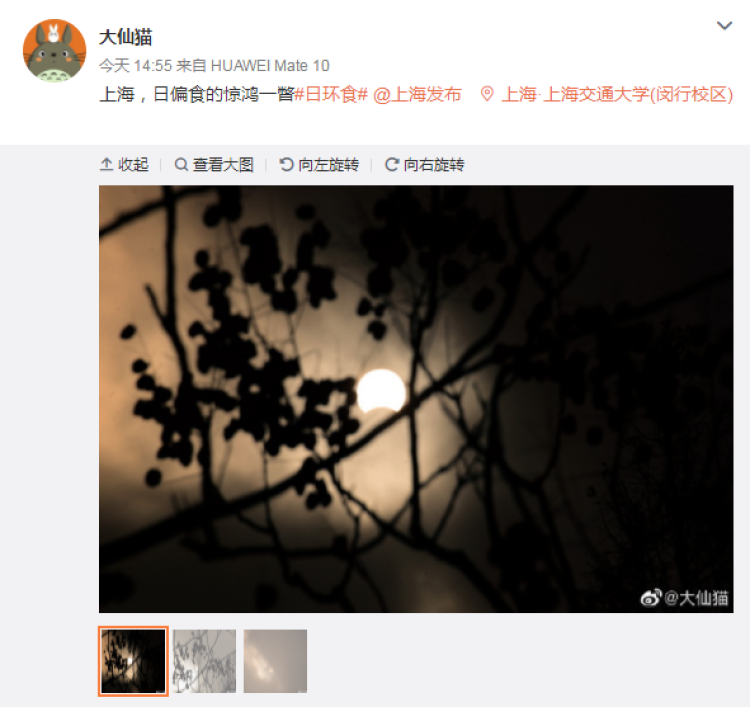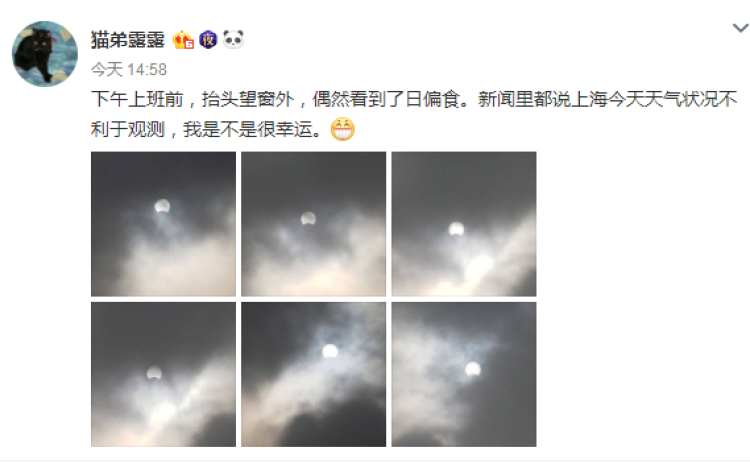 至于上海,今日阴天加下雨,天气状况不佳,着实不利于观赏和拍摄日偏食,不少小伙伴直言就在微博上等着围观了。不过,周到君发现还是有些坐标上海的网友表示自己幸运地拍到了日偏食图片,并在微博上秀了出来~