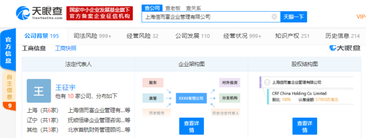 天眼查数据显示,信而富成立于2005年7月,注册资本5790万美元,公司法定代表人王征宇。