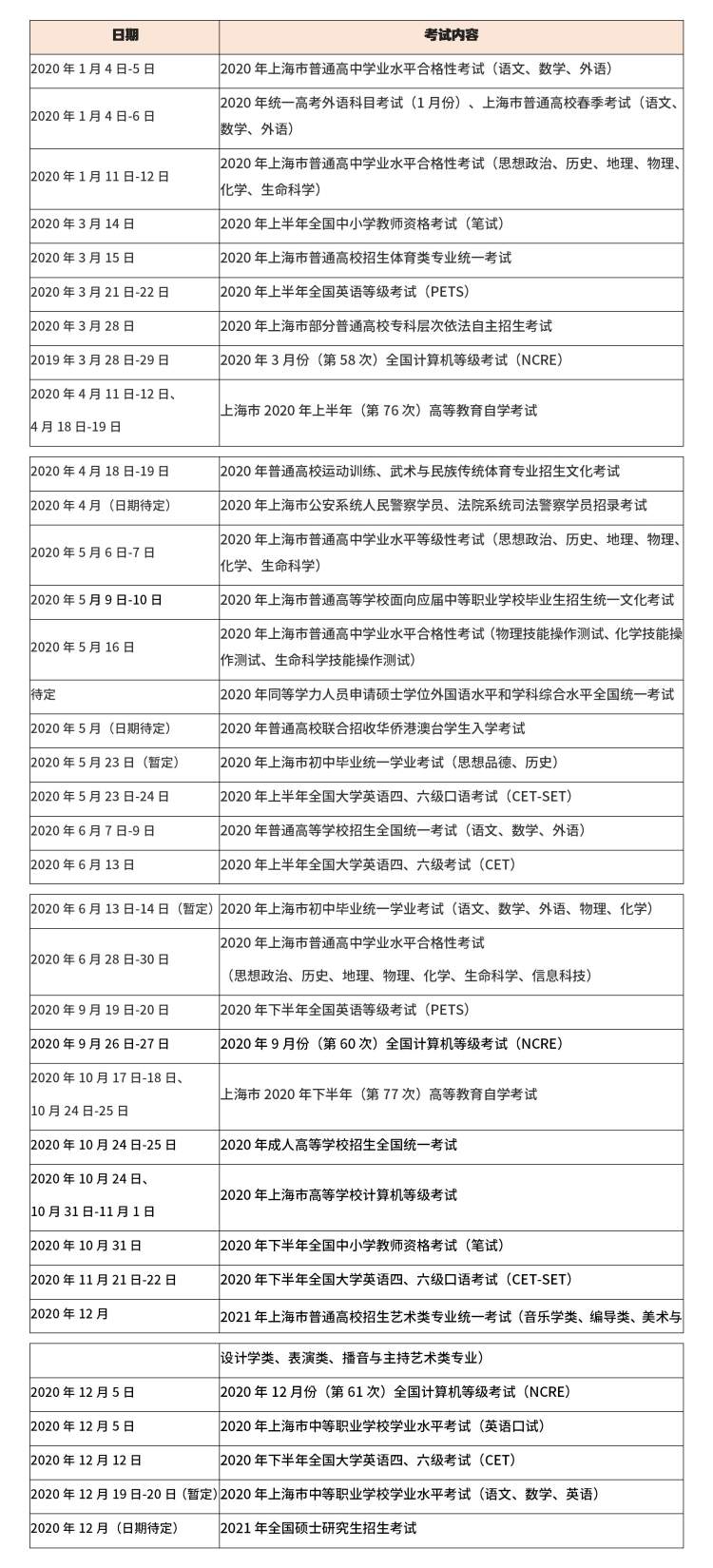 市教育考试院发布2020年各类考试信息,你关心的重要考试时间安排定了 徐斌忠 2019-12-27 来源:周到上海 上海市教育考试院通过“上海招考热线”网站,公布了2020年度上海市教育考试院各类考试信息一览表。 2020年1月份,重要的考试主要是春季高考和2020年上海市普通高中学业水平合格性考试。 市教育考试院公布的考试信息显示,2020年上海中考的时间暂定为6月13日-14日。 附:2020年度上海市教育考试院各类考试信息一览表 来源:周到上海 作者:徐斌忠 赞一个 (0)