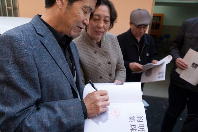 潍坊新村街道东南居民区总支部的这场“不忘初心、牢记使命”的专题学习会上,每位党员都收获了一本刊印的《明珠韵集》画集。东南居民区党总支书记谢润生表示,这本极具传播和教育意义的红色画册教材不仅能让大家睹画思责,更能体现大家把思想和行动统一到习近平总书记的重要讲话和全会精神上来。而通过此次专题学习活动,不少党员也为岳长斌的创作初心感到动容。
