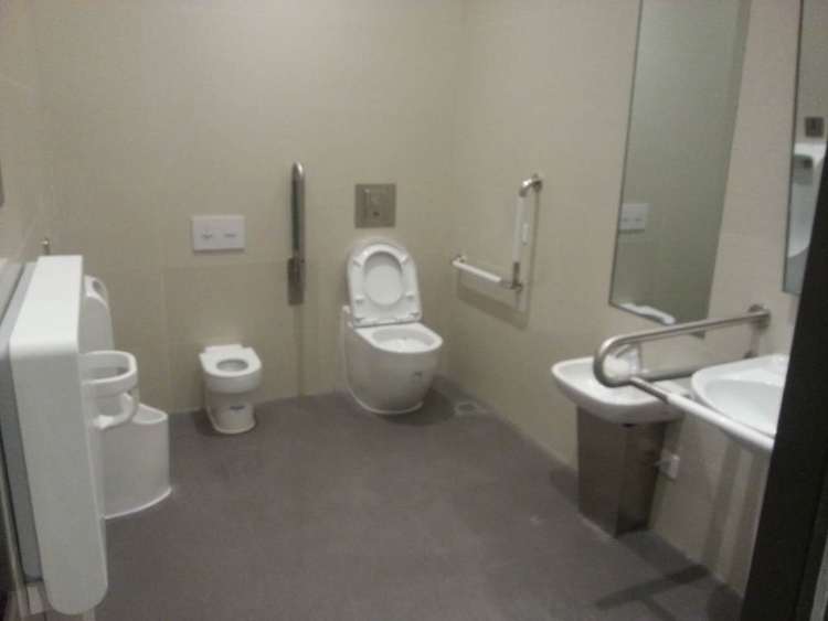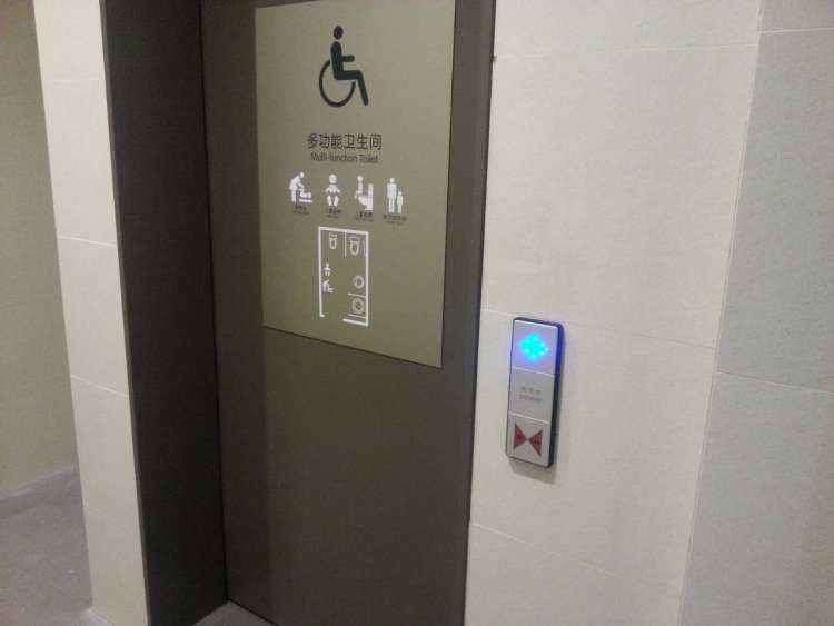 一直往里走,一套完善的卫生间设施出现在道路侧面,不仅有男女卫生间,还设有专门的“第三卫生间”(多功能卫生间),门口有蓝色的开门按钮,用手一按即可开门。进去后不用自己动手,门会自动关上。只见这里设置有母婴及残疾人专用设备,看上去极为洁净。