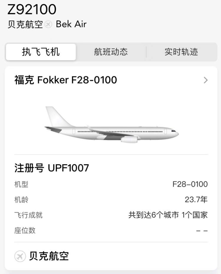 据悉,该航班执飞机型为一架1996生产的Fokker 100,所属的航空公司Bek Air是哈萨克斯坦的一家支线航空公司,拥有十架Fokker 100飞机。