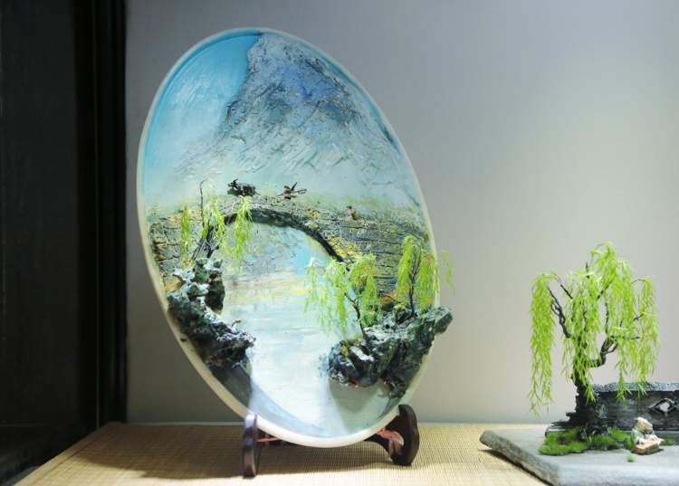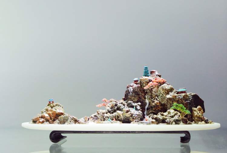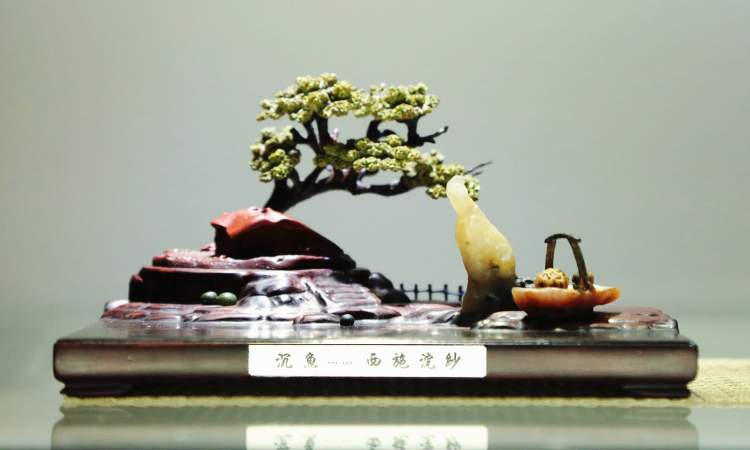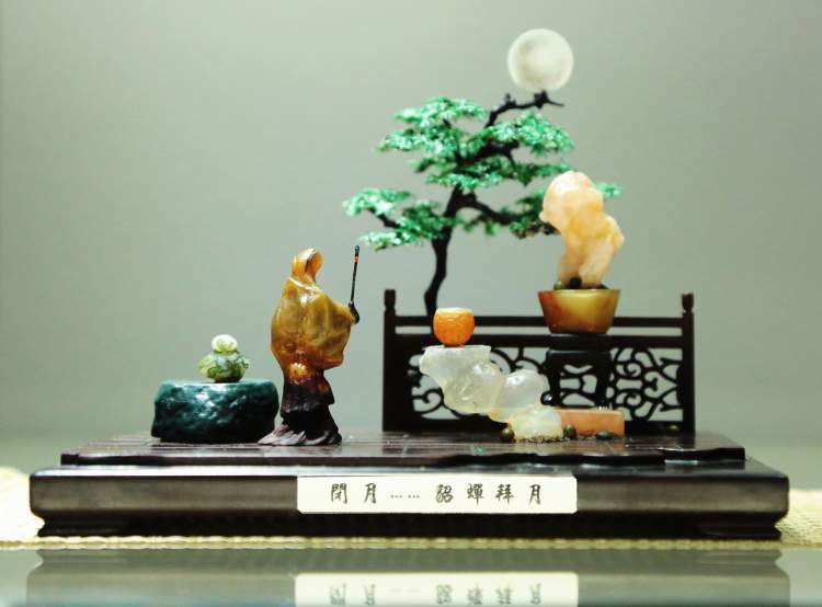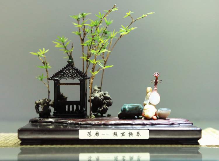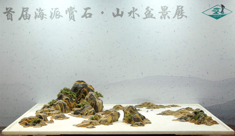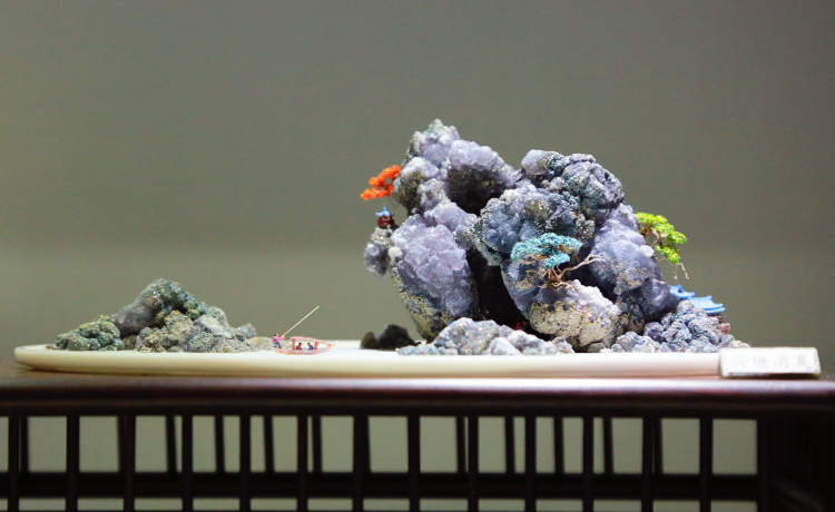 除赏石之外,同场展出的还有近百件精美的山水盆景。与树木盆景不同,山水盆景以石材为主创材料,配以适宜的植物,盆中亭台楼阁,舟楫桥梁,丈山尺树,寸马分人,完美诠释“一峰则太华千寻,一勺则江湖万里”。山石盆景小中见大、缩龙成寸,具备现实时空和艺术时空的审美二重性。千山多入画,只取一青峰。山有三远,高远突兀,深远重叠,平远缥缈,将人的情感在有限的空间里无限蔓延,展现放马南山、刀剑入库的悠然景象,方显山石盆景之精妙。